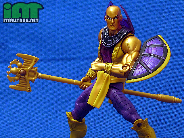 Pharaoh’s still in his original color scheme with a few tweaks. I wasn’t originally hot on the golden skin tone when I first saw him, but I was wrong. It really sells the figure and helps differentiate between the suit and the skin. The pearlized yellow on the armored pieces contrasts great with the flat yellow and purple on the cloth areas. Finally, the clear purple – his see-thru chest in particular – really looks great. His articulation is pretty much standard for the line and he features good range of movement.
