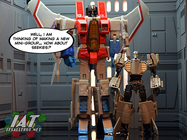 The upside to all the tabbing is a pretty slick alt mode. He feels a little chibi for an F-15 Eagle, but he looks good. This is the one place where he feels small though. At 6”, he’s tall in his bot mode and I like it. As an F-15 he just seems a little small. He looks good with Tank, so that’s all that really matters. And I’ll be the first to admit that I’m spoiled by all these great MP Seekers that I don’t review.